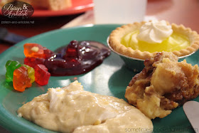 Dessert time! I took it easy. I got a mini lemon meringue pie, some gummi bears, banana pudding, bread pudding and some strawberry topping. I put the strawberry stuff on the gummy bears because, well, I think it tastes good. The desserts were yummy, especially that banana pudding. It tastes like real bananas!