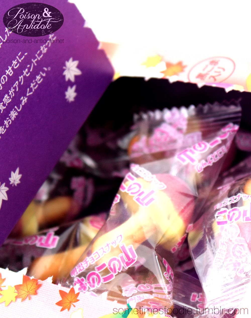 Inside are individually wrapped little ‘mushrooms.’ Each one has a purple, taro, top and a white chocolate bottom. The white chocolate is mixed with black sesame seeds. It has the same biscuit stick as original Chocorooms.