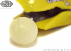 As soon as I put it in my mouth, I knew this candy was just like Warheads! (90’s kids know what I’m talking about!) The outside is covered in a very fine lemon-flavored sour powder, that gives way to a sweet lemonade-like layer of hard candy, and then the center tastes just like lemon juice! The center has a authentic lemon juice taste, but it isn’t as sour as the powdered layer.