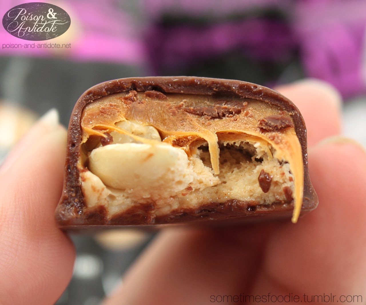 It has a really soft bite, and the chocolate instantly started melting in my mouth. I taste crunchy peanuts, a textured nougat, and sweet stringy caramel. THIS is what real candy is supposed to taste like.