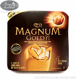 The packaging really plays up the ‘gold’ aspect. The font is gold, the bar is glowing with a gold aura, and the typical Magnum logo has been morphed into a vault. For a brand that tries to appear high end and sophisticated, this is pretty playful. I think the design works well and it definitely caught my eye.