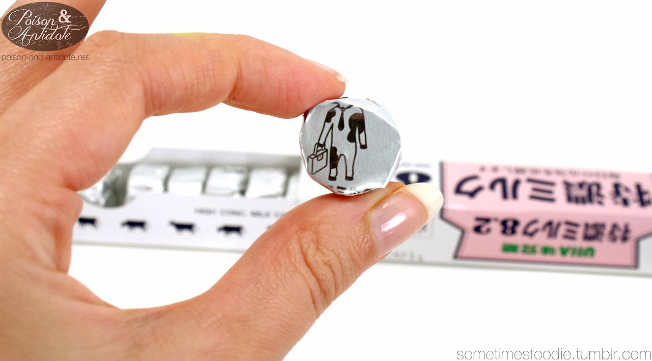 Opening the candy, I was pleasantly surprised by the little sliding tray! Inside the cardboard tray, there are tiny puck-shaped candies wrapped in silver foil. Everything is really conveniently packaged and well put together. The candy wrapper designs are surprisingly playful. They have cute little cows doing human things. ( I seem to have a businessman-cow on this wrapper.)
