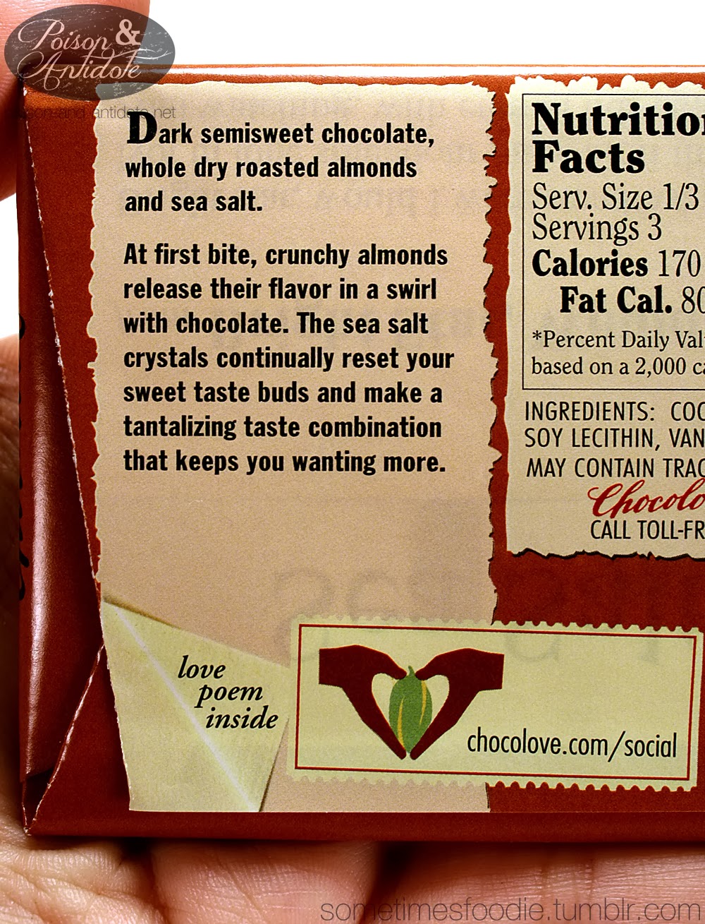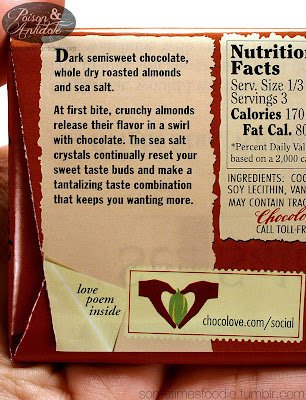 I have never seen this brand of chocolate bar before. What made me pick this up? It comes with a love poem! I am used to my chocolate giving advice, craft tips, and compliments, but never a full blown poem.