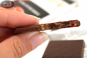 Sadly, this chocolate bar smells a little perfume-y. (Which isn’t a good start.) There are some fruity notes that remind me of strawberry jam, but they are easily overpowered by cocoa powder.