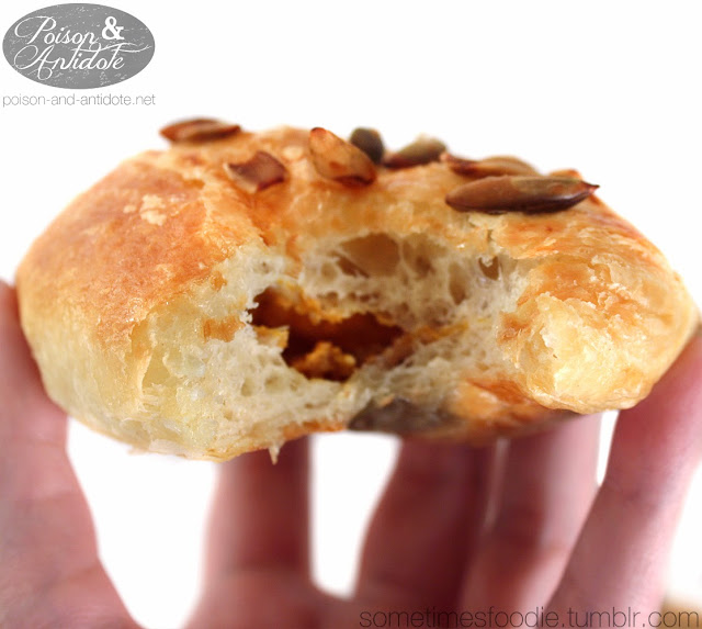On it's own, the croissant dough is buttery, flaky, fluffy, and perfect in every way. This is honestly one of the best croissants I have ever had! As for the pumpkin aspect, there was only a tiny bit of filling inside and some scattered pumpkin seeds on top. The filling is similar to pumpkin pie filling, but there is only a tablespoons worth inside the giant flaky pastry, making the croissant dough the star of the show. (Rhyme time?) These were incredibly delicious, but not as pumpkin-y as I had hoped.