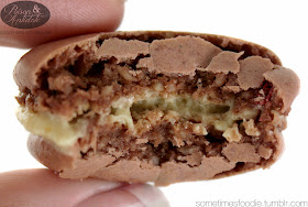 (green): Sadly I forgot to take a "bitten" photo of this one. Unlike the coffee version, the meringue cookies do not taste much like their namesake. The almond flavoring overpowers the pistachio, other than the obvious coloring, I can barely tell that it is supposed to be pistachio at all. The biscuits may not taste authentic, but just like the raspberry flavor I reviewed last week, the flavor payoff is in the filling. There is a rich, gritty, pistachio paste that holds these two biscuits together. Texturally, the filling is very similar to peanut butter. (Is that a thing? Can you buy/make pistachio butter?) I typically love pistachio flavored treats, but I wasn't too wowed by this pastry as a whole. This might be my least favorite of the bunch.