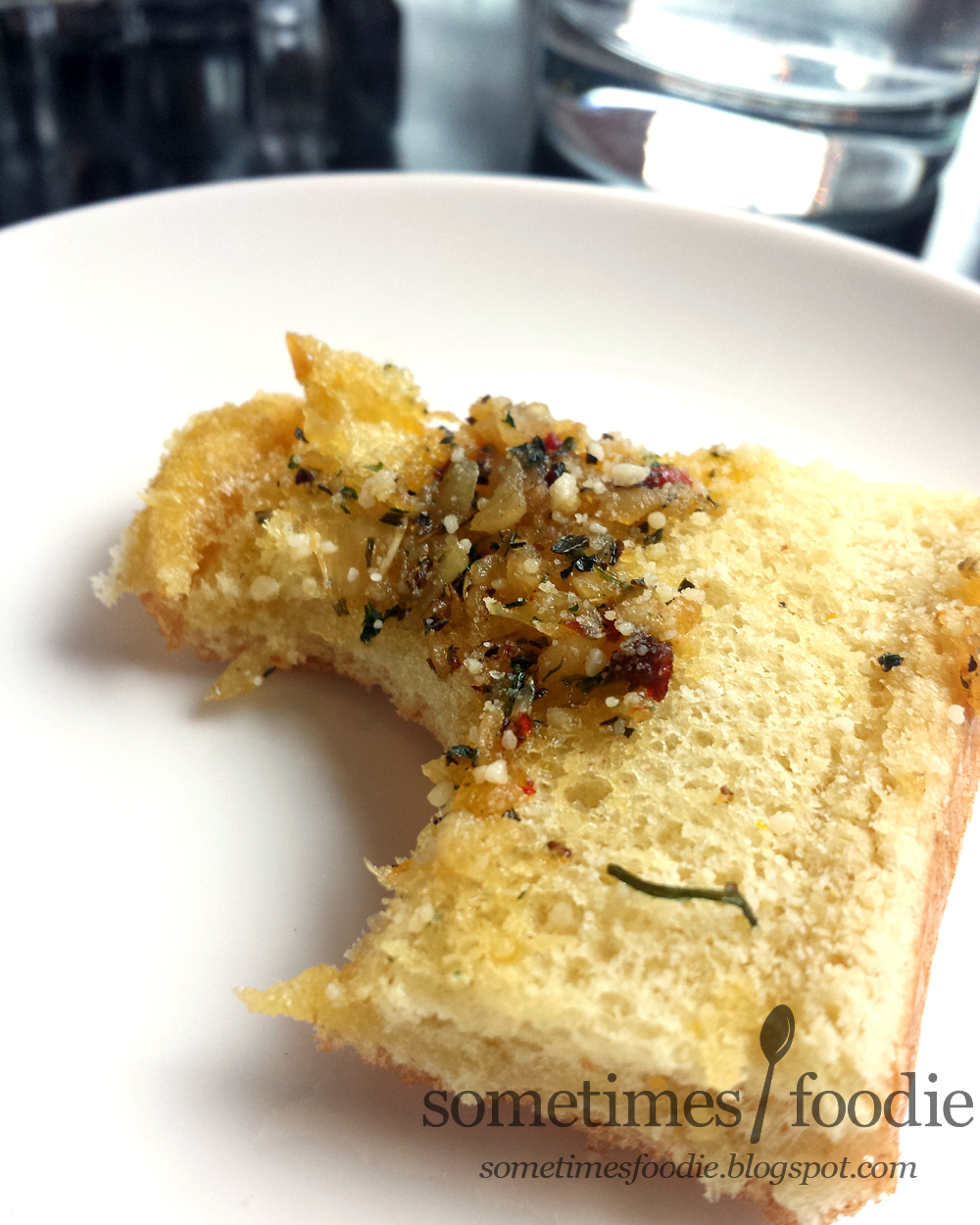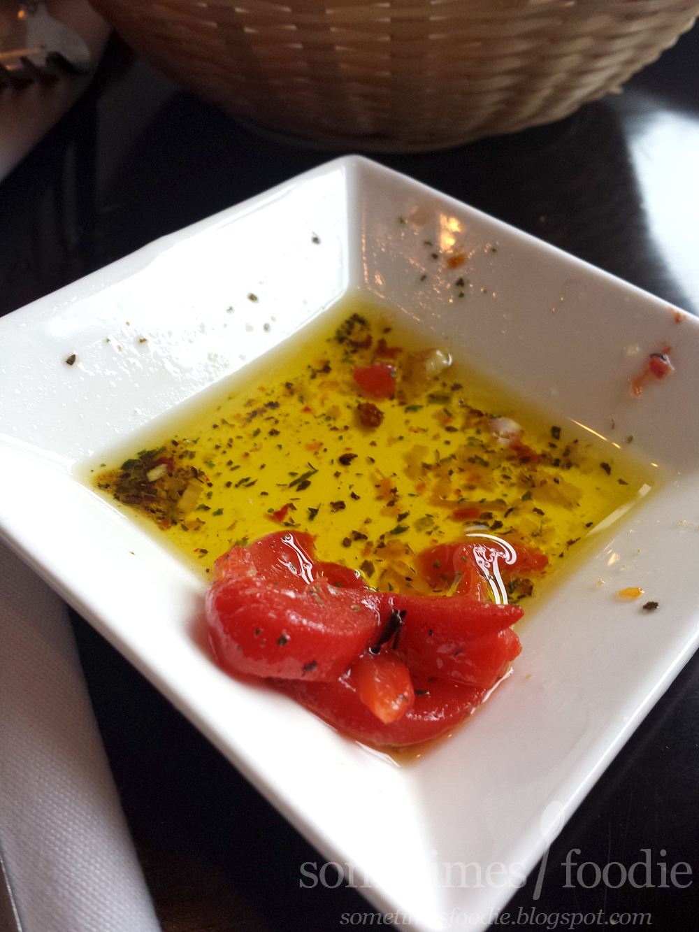 To start things off, we were given a beautiful basket of garlic and cheese bread with some red peppers and some herb-infused olive oil.