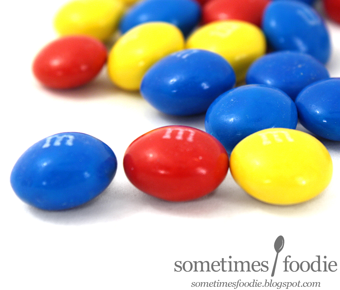 Since I read Candyblog's review, I wasn't surprised by what I found inside the package. These m&m's are larger than the normal milk chocolate variety, I'd say these are about the same size as the Cherry and Raspberry flavored m&m's that were released a few years ago in similar single serve packaging. On top of being bigger, these candies are only in the primary colors. Looking at these reminds me of my days working at a daycare, not birthday parties or cake.