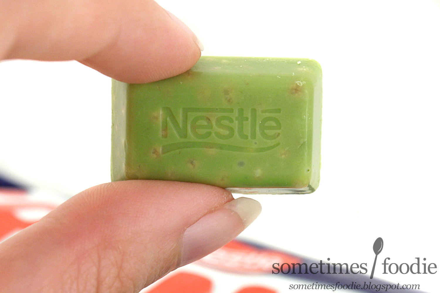 Once opened, I could see that the candy bar was a lovely pistachio-green color. It smells sweet, like white chocolate, but it also has a grassy matcha aroma. If any of you have had matcha before, it smells and tastes earthy and natural. I liken it to wheat grass, which doesn't sound very appetizing, but it can be a bit of an acquired taste.