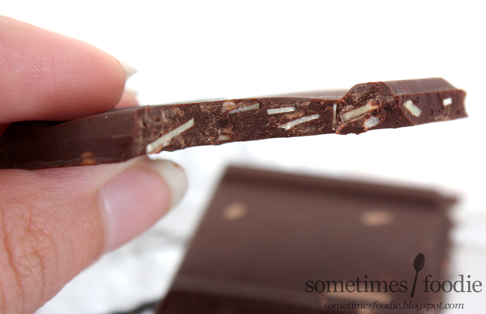 The packaging for this candy bar is similar to Ghirardelli, Lindt, and other higher-end chocolate bars, but I feel like the overall design is more modern and a bit less sophisticated. Since I am more of a modern art fan, and I love faux texturing, I really like this package. Nothing is perfectly centered, and I think that makes everything a lot more interesting, plus there are little detailed design elements everywhere. You can see a hint of the UV gloss scroll pattern at the top of the packaging, and the rest of the matte cardboard box has a faux marble overlay. This little candy box makes me very happy as a graphic designer, although I feel like the text on the back is a little bit too large. (Then again I have a tendency for my designs to have thin and small texts, and I have very good eyes. It might just be my personal preference.) Inside the box, the candy bar is sealed inside a sheet of shiny silver foil. The foil wrapping is plain and unmarked, but it's actual foil! It's been a while since I've had a candy bar that was sealed in foil and not a silvery plastic. It might seem a bit plain, but the cardboard sleeve more than makes up for the lack of design.