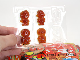 Inside the package is a thin, clear, plastic tray with little impressions of the characters from the show that have been filled with a cola flavored gummy mixture. Their backs are covered with an ultra thin sheet of edible paper, I'm guessing rice paper, and they have a strong cola candy scent.