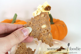 I peeled back the plastic seal, and right away I see a problem. The cannoli chip to dip ratio is way off! In my package I had 4 complete chips and a few shard of chip shrapnel. Compare that to the ample amount of pumpkin dip on the right and, unless you're loading these chips up really heavily with the cheese mixture, you're going to have a decent amount left over. The chips are crispy and light, similar to a cannoli shell, and they are covered in a mixture of cinnamon and sugar. To me, the sugar mixture seems very fine, more like the coating of Cinnamon Toast Crunch than an actual blend of granulated sugar and ground cinnamon, and on their own the chips were really enjoyable. (Although they had a slightly stale texture from being refrigerated.)
