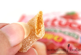 The packaging consists of a thin plastic bag, so thin you can see through the top portion to the other side, and a zip-lock top. Due to it's bright pink and red color scheme, this item really stood out. I originally bought this thinking it would make a good item to review in February, since it's so pink and there's Valentine's Day and all, but I never really got around to it before the holiday. (It's still February, so that still works, right?) I love the images of fruit that were used, and the water droplets at the top of the packaging make this feel like it's going to be a really refreshing candy. The overall design is busy, without being overly busy, and all the necessary information is provided. I like this packaging a lot, and it's resealable, which is always awesome, but the visuals aren't as nice as some of the other Asian candies I have reviewed in the past.