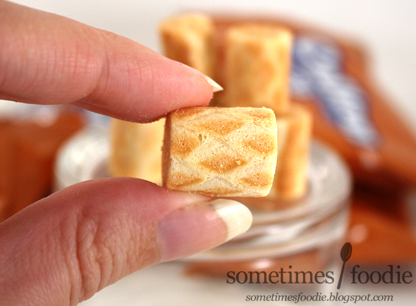 I peeled the little packet open and inside were little wafer logs filled with creme. The wafer-y outside was very thin and delicate, but it had a beautiful diamond patter. Look how gorgeous they are! Like I said, they were very delicate, and there was quite a bit of wafer flakes and pieces broken up inside the little baggy, but there were still enough fully-intact Collons for me to make a little pyramid, which made my pyramid-food stacking obsession very happy. (I am sure some of you have noticed, but if I can, I always stack the food items into a little pyramid. It's a compulsion.)
