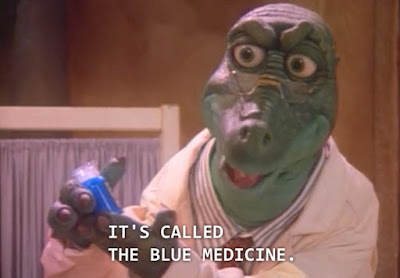 Did any of you ever watch Dinosaurs? For those of you unfamiliar with the show, it focuses on a family of dinosaurs. (Surprise! totally not obvious at all, right?) They have the typical family sitcom problems, but the social commentary is still fresh after all these years. I grew up loving the show and I own every episode on DVD. If you're not a crazy DVD hoarder like me (mine are organized by color, but this isn't even half of my collection) the entire series is available on Netflix. If you ever have a free moment, watch the season 3 episode titled "Germ Warfare." In this specific episode, Baby gets sick, and his parents spend a ton of money on fancy medicines to make him better, one of which happens to be blue and costs $1000.00. The entire series is really hilarious and very well written, and I honestly feel like it never got the credit it deserved. Anyway, my sister and I make references to it all the time, one of our favorites being "it's blue."