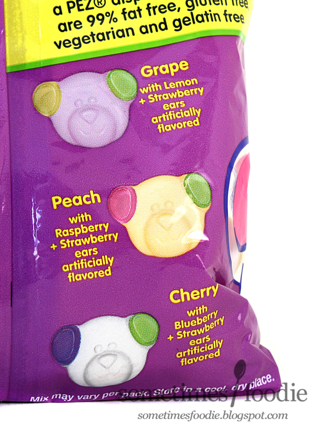 This packaging definitely looks like something you would find at a dollarstore. I'm not trying to pick on cheaper products, I'm a verycheapfrugal consumer, but everything about this design makes it really unappealing. The color scheme, which reminds me of Barney the Dinosaur on acid, is really obnoxious and it distracts me from being able to read any of the information on the bag. Plus, the ultra thin plastic allows me to see the text on the other side which is even more distracting. I'm just going to come out and say it. This bag is ugly. It's such a shame, because I felt like PEZ had some great packaging in the 90's, but these days they've gotten really lazy. Their lack of effort really shows in this one, both in the candy concept, and the package design.