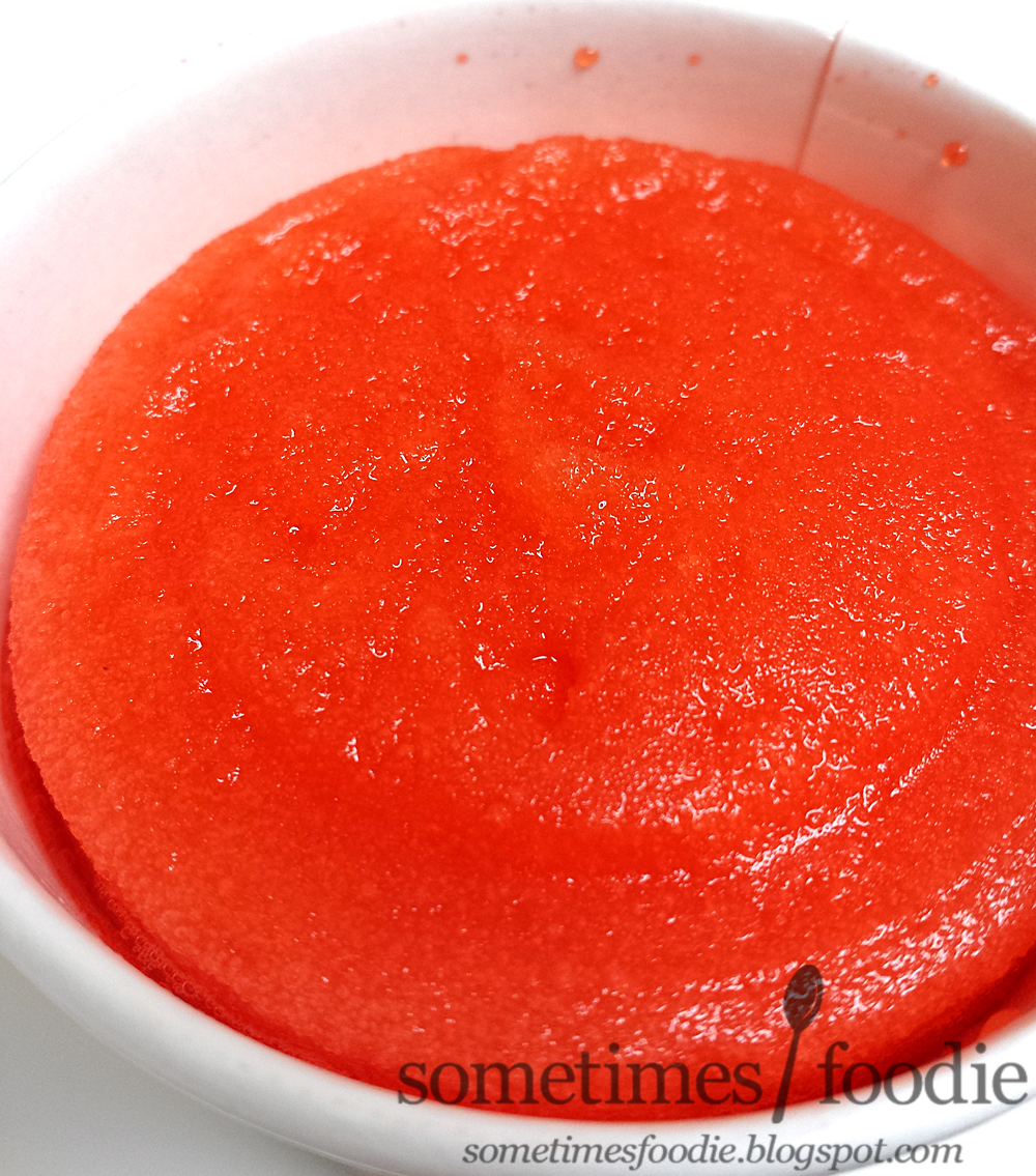 I grabbed my spoon and dug right in. I'm happy to report that this does taste different from the classic orange and Starburst orange flavors. It's not just the same ol' syrup with some red food dye. When compared to a typical orange, this is a lot milder, a bit zestier, and kind of grapefruit-y. It's also way more authentic and enjoyable than the Starburst variety. So this is sweet, zesty, fruity, and refreshing, but it really doesn't taste like blood orange. I've had actual sliced blood orange before, and it has this lovely deeper flavoring that's really lovely, almost berry-like. It's hard to describe, but there is a notable difference in flavor between a normal and blood orange. (As pretentious as that sounds.)