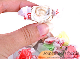 This one is a beige-y color with specks of cinnamon and a swirl of brownish tan-colored taffy in the middle. Unwrapped, it smells sweet and cinnamon-heavy, but there's a hint of vanilla and maybe even cream cheese flavoring in there somewhere. It's one of those sweet vanilla aromas with a sour tang to it. I took a bite, and it starts out feeling like I took a bite out of some ready to bake cinnamon bun dough, but as you chew the cinnamon flavoring gets warmer and brighter. It's vanilla-y, buttery, sweet, a little spicy, and very well balanced. I'm really impressed! This isn't your run of the mill cinnamon flavored taffy, this is truly cinnamon bun!