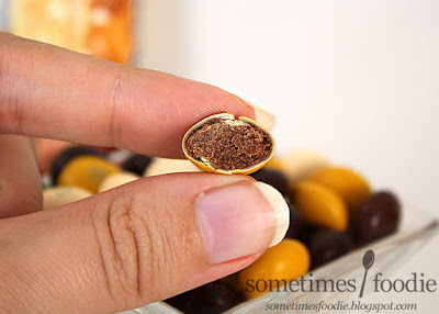 The candies have a vague nutty smell to them which reminds me of roasted coffee beans and pecan scented candles. It's not a terribly off putting scent, but it is kind of processed and it remind me of a seasonal Bath & Body Works hand sanitizer I have in my purse called Pumpkin Pecan Waffles. Since the candy base for these is milk chocolate, I'm a bit concerned about how this is going to taste. Pecan pie isn't chocolate-y! Will this be as bit of a flop as last year's Pumpkin Spice version?