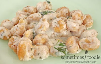On their own, the gnocchi taste starchy, slightly sweet and squashy. They're yummy, but they need a sauce to help them out, and Alfredo was definitely the way to go. The sweet pumpkin flavoring paired nicely with the salty cheese sauce, and the spinach prevented this from being entirely unhealthy.