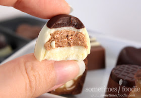 This one has a contrasting filling of "Passion Fruit Supreme." (White chocolate truffle infused with passion fruit.) This chocolate was still sweeter than I usually like my dark chocolates to be, but I liked it more than the milk chocolate. As for the filling, it was light and buttery, with an impressively rich texture, but the flavor payoff was pretty weak. This filling was slightly fruity, but not as intense as I thought it'd be with a name like, "Passion Fruit Supreme." Then again I'm not particularly fond of passion fruit, so this might have been a blessing in disguise. Even though the flavoring was weak, I really liked the consistency of the filling inside and how nicely it melted.