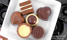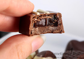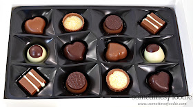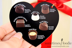 The six flavors have a pretty nice variety of dark and milk chocolate and adorable shapes. (Only the heart shape is repeated with a different coating and filling combo.) Do they look fancy and high end? I don't really think so, but they look a lot nicer than the candies you typically get in grocery store boxes and assortments, and the flavor variety is pretty unique.