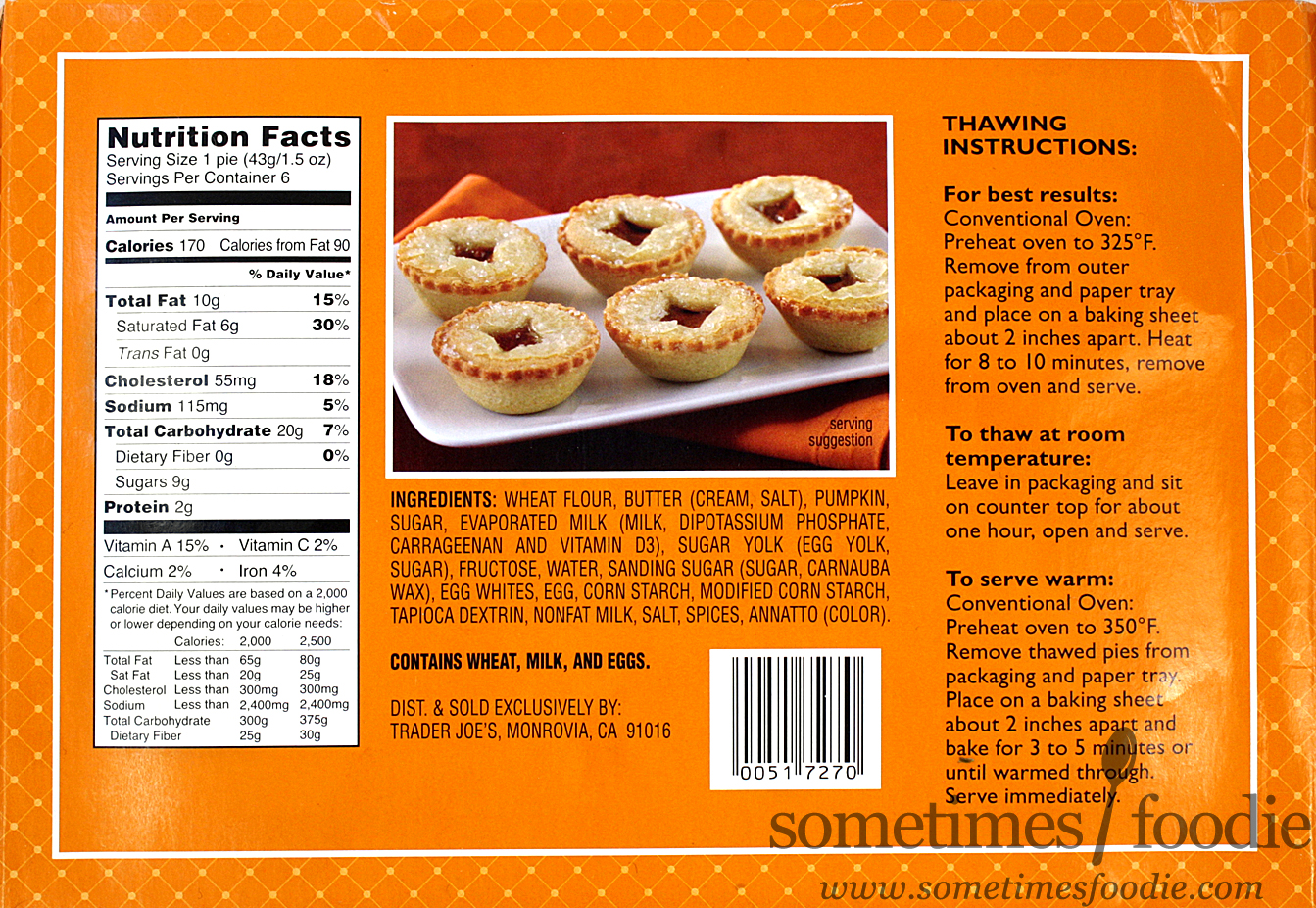 Packaging-wise, this is pretty nice. The warm golden orange color is really reminiscent of fall and pumpkin pie, and the majority of the design is a product photo. The image isn't as sharp or polished other frozen pie-products on the market, and it has that typical overly warm yellow-red cast to it (like all Trader Joe's product photos), but it's not bad. I love food photos and imagery (which is kinda why I run a food blog...), so the fact that the image takes up the majority of the box is okay by me!