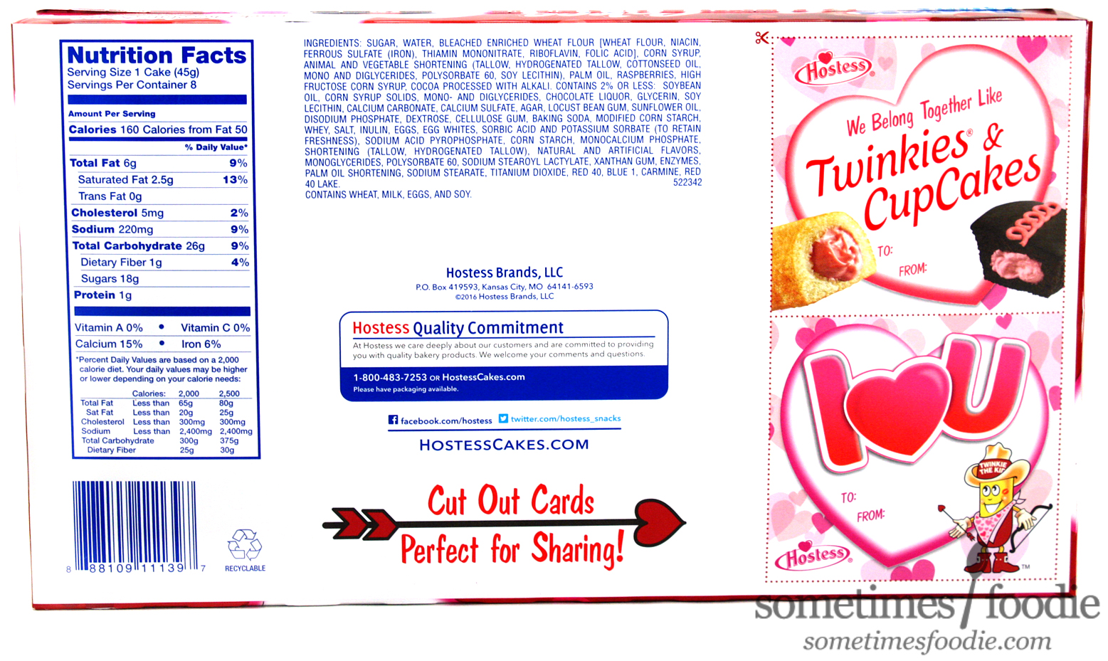 On the back the box Hostess gives you two cut-out style Valentine's Day cards related to their products, which are cute, and I like the idea that this box is trying to give you more bang for your buck, but I don't think these will really work. It's a fairly obvious marketing ploy on their part, so unless you REALLY REALLY like their products, it'll likely be met with rolled eyes and maybe a little scorn. Now, if the other side of these valentine's were printed with a coupon, saving someone x-amount on Twinkies or something, it'd be a better marketing concept. That way the general consumer can either keep them for themselves and purchase more Hostess products, or you'd be giving someone, likely a Twinkie or Hostess fan, a way to save a little money on something they enjoy along with a silly novelty Valentine.