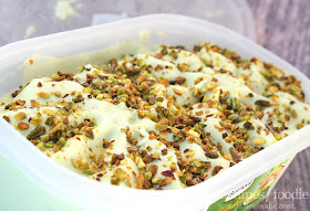 So pretty... The base is a lovely pale green color, with a generous amount of crumbled pistachios on top. This is similar to the pans of gelato I saw Italy a few years ago.
