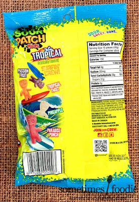 Let's talk packaging. We have a plastic bag with the recognizable Sour Patch Kids yellow in the background, a giant logo, some palm trees, scattered "kids" and a lovely contrasting blue shade around the outer edges. The color of the kids in this mix are reminiscent of a sunset, as seen in the smaller "tropical" logo in the bottom right corner, and if you look closely, the edges around that blue color are actually itty bitty Sour Patch Kid shapes. I like that the company takes every opportunity they have to wedge that recognizable kid-shape into their designs, and the complimentary color scheme is definitely eye catching, but the flavors in this bag seem a little...lazy.