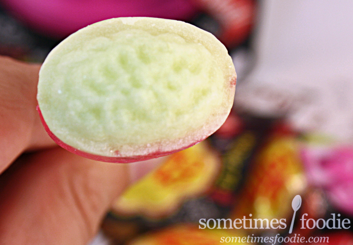Unwrapped, the candy doesn't have much of a smell. There's something faintly sweet, and a little creamy, which reminds me of fruit and cream Lifesavers lollipops I used to love as a kid, but there's nothing mind blowing about those, so I doubt they'll taste the same.