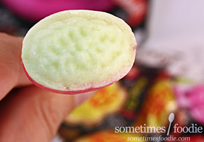 After nearly an hour, and finally crunching this tiny cranium to bits, I'm still not 100% sure what this flavoring is. Going with my tastebuds, I want to say it's a tangy lime ramune, but my gut tells me this is some kind of tangy take on muscat grape. I'm going to go with: This looks purple, but tastes green. Hopefully that makes as much sense to you guys as it does to me. **AH-HA! I found (and google-translated) this page which says these are strawberry LIME flavored. I was 50% right!